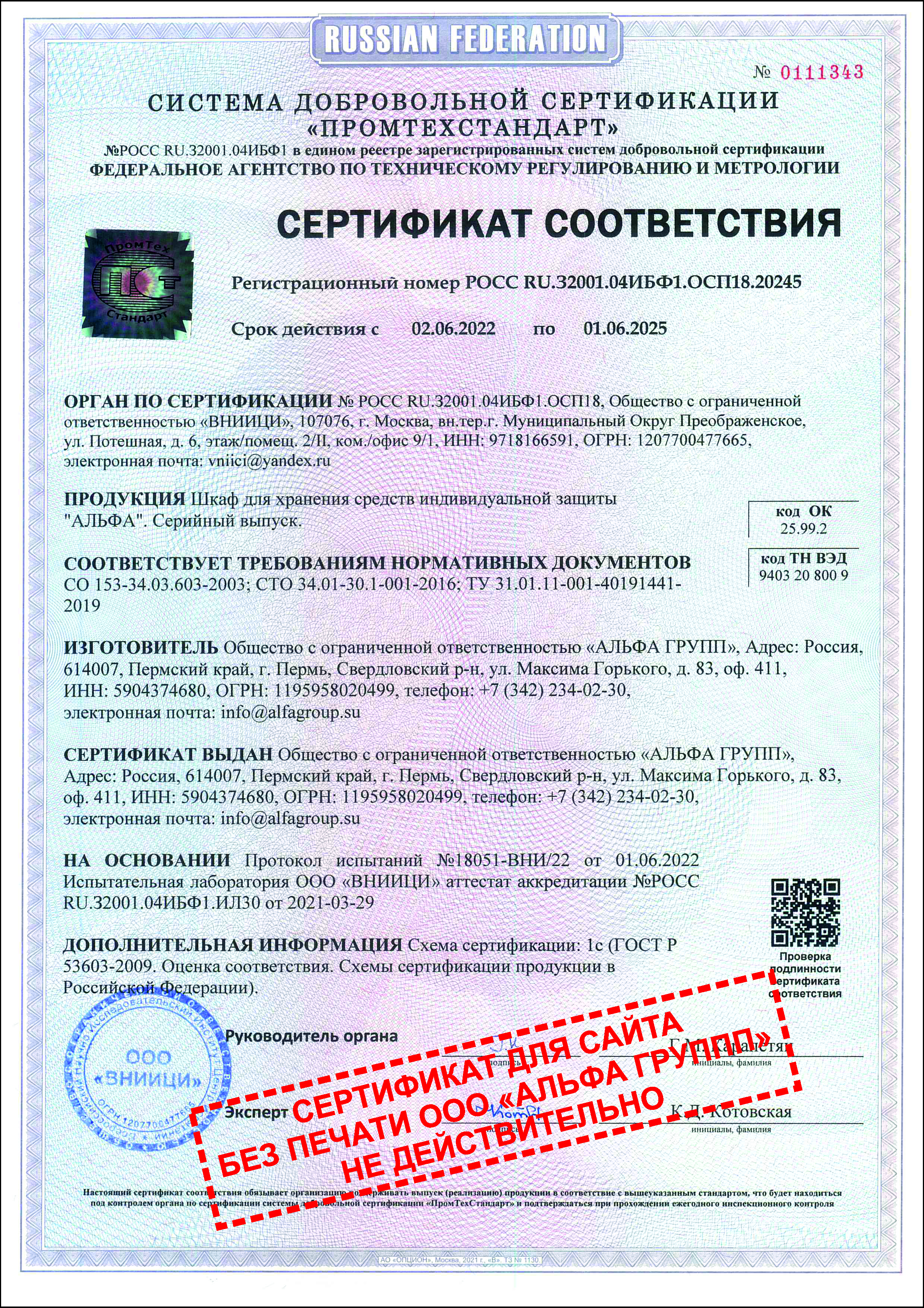 Шкаф хранения средств индивидуальной защиты с торговой маркой «АЛЬФА». Каталожный лист продукции "ПРОИЗВОДИТЕЛЕЙ РОССИИ" регистрационный № 020359 Федеральное бюджетное учреждение «Государственный региональный центр стандартизации, метрологии и испытаний в г. Санкт-Петербурге и Ленинградской области» (ФБУ «Тест-С.-Петербург»)